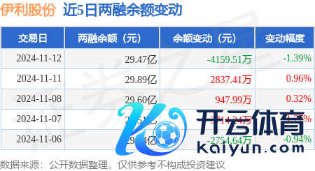 本站音讯,11月12日,伊利股份(600887)融资买入9059.52万元,融资偿还1.35亿元,融资净卖出4391.46万元,融资余额29.27亿元。