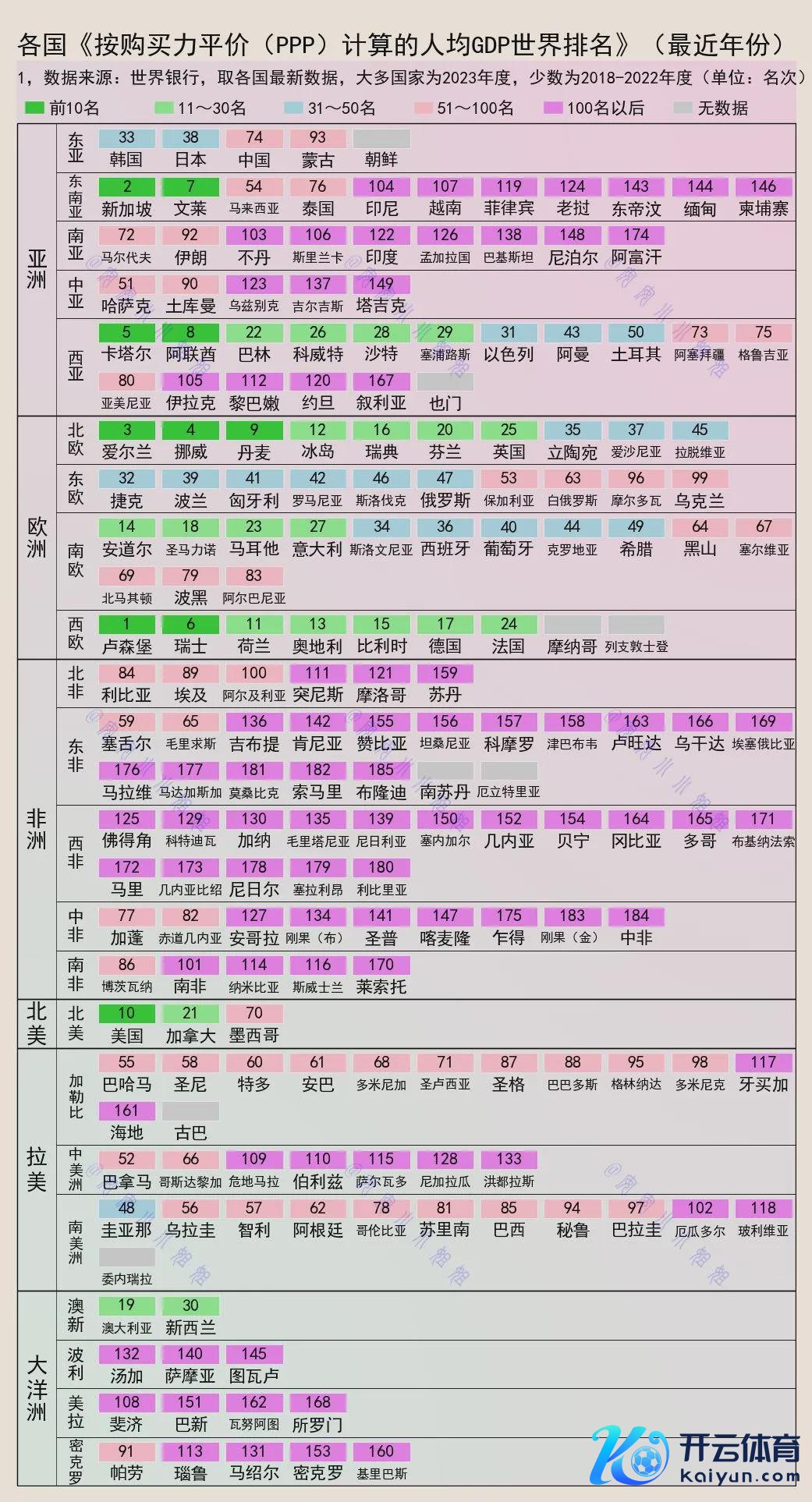 下图展示了列国按照购买力平价(PPP)谋划的东说念主均GDP,活着界上的排名情况,大多国度数据是2023年度,少数为2018-2022年度。