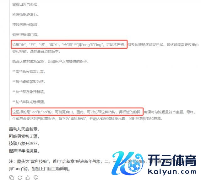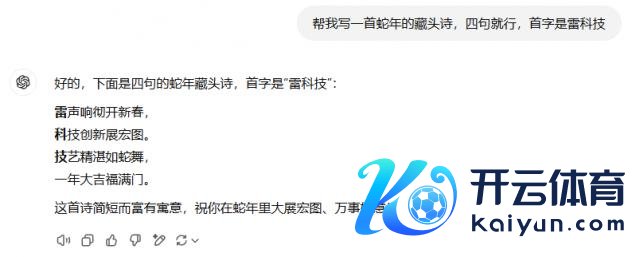 Deepseek V3 给出的后果是"雷动九天迎新春,科峰登顶志凌云。技展宏图开盛世,蛇舞祯祥福满门"。