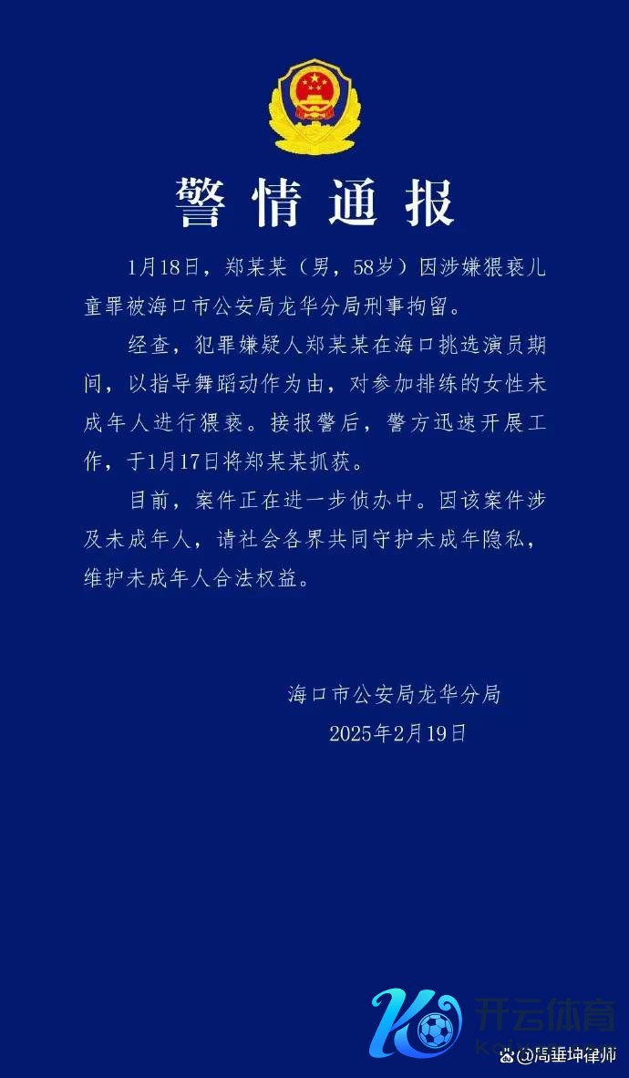 导演郑某峰涉嫌猥亵儿童被刑拘,曾参演电影《好意思东谈主鱼》中的“郑总”一角!凭据警方发布音讯,2025年1月,郑某峰在海口挑选演员时刻,以“引导跳摆动作”为由,对参与排演的女性未成年东谈主试验猥亵! 1月17日,警方接警后连忙将其握获,并于次日照章刑事拘留。